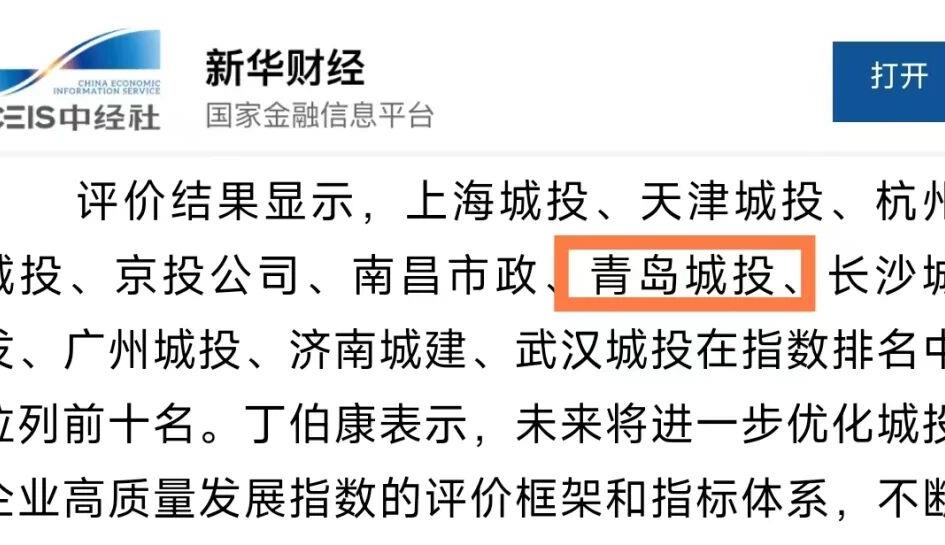 青島城投集團榮登中國城投企業高質量發展指數排行榜第六名